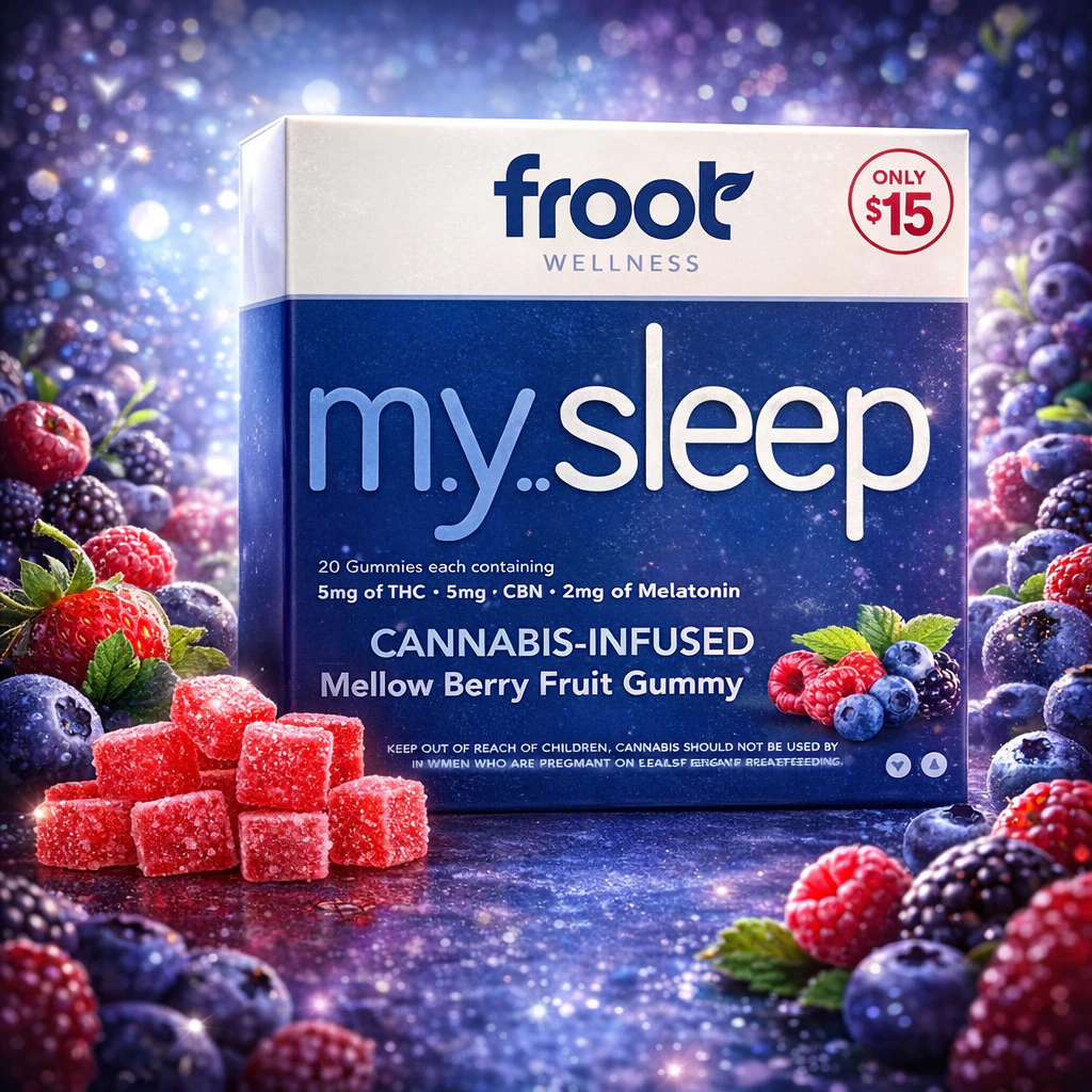 M.Y. Sleep by Froot is specially developed to Make You Sleep. M.Y. Sleep is formulated with THC CBN and PhytoMelatonin ro give your body and mind the sleep you deserve. M.Y. Sleep uses only the highest quality ingredients to ensure an effective great tasting and consistently dosed gummy. Fall asleep stay asleep and wake up feeling refreshed. Get the sleep you deserve m.y. sleep. 20 pieces each with 5mg THC 2mg CBN 2mg Phytomelatonin (100mg total THC 40mg total CBN 40mg total PhytoMelatonin)
