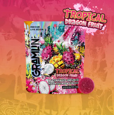 Tropical Dragon Fruit Rosin Gummies unleash a sweet fusion of dragon fruit, mango, guava, and coconut. Each juicy gummy is infused with 10mg of solventless hash rosin from fire indoor indica flower and packs a full-bodied buzz that will rock you from crown to kicks. Unlock Gramlin Mode like never before.