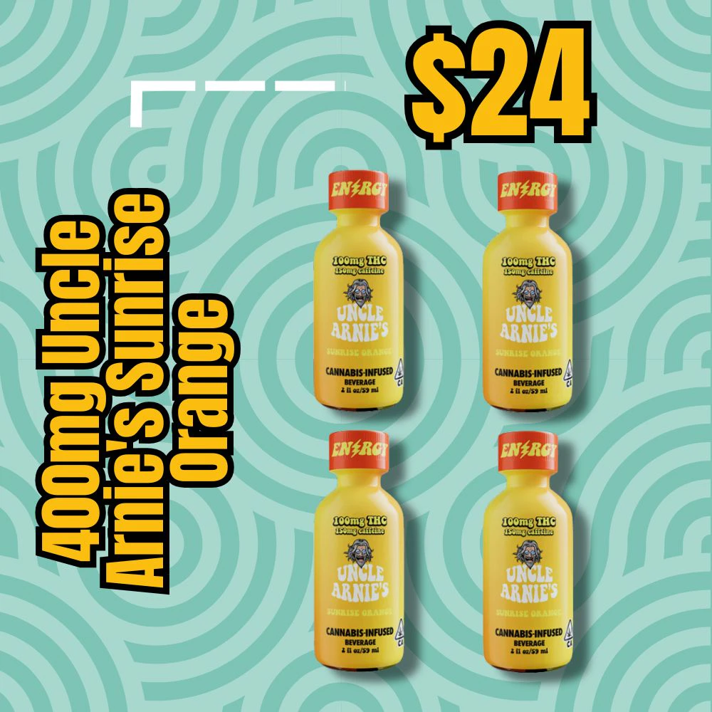 Rise and shine with the Uncle Arnie's 100mg THC Sunrise Orange Shot. This two ounce shot, has Sunny D vibes and is packed with 150mg of Caffeine. Which is about 2 shots of Espresso, so try skipping that coffee and adding this to your morning smoothie. Perfect for that on-the-go morning hustle. Just like the classic 8 ounce drinks, these are infused with nano-emulsion technology. You can control your high or get as lit as you want by using the dosed measurement system. Expect your rocket to blast off in 20-40 minutes.